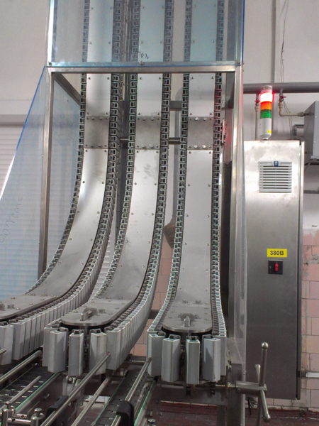 Гріперний конвеєр – це транспортер, який використовують для вертикального, міжрівневого переміщення штучної продукції (пляшки, банки, пачки, упаковки, невеликі коробки тощо) на інший рівень (поверх), для інспекції або маркування, для обгинання перешкод, що знаходяться на шляху лінії транспортування. У гріперному конвеєрі вантаж фіксується між двома ланцюгами, що паралельно рухаються, оснащеними спеціальними накладками з гріперними, гумовими захопленнями. Гріперні накладки м'яко та надійно утримують вантаж і переміщують його заданою траєкторією. Застосовуємо гріперні ланцюги виробництва Rexnord (Голландія), System Plast (Італія), Movex (Італія), направляючі з високомолекулярного поліетилену виробництва Rexnord (Голландія), System Plast (Італія), Movex (Італія) чи Голландії.
